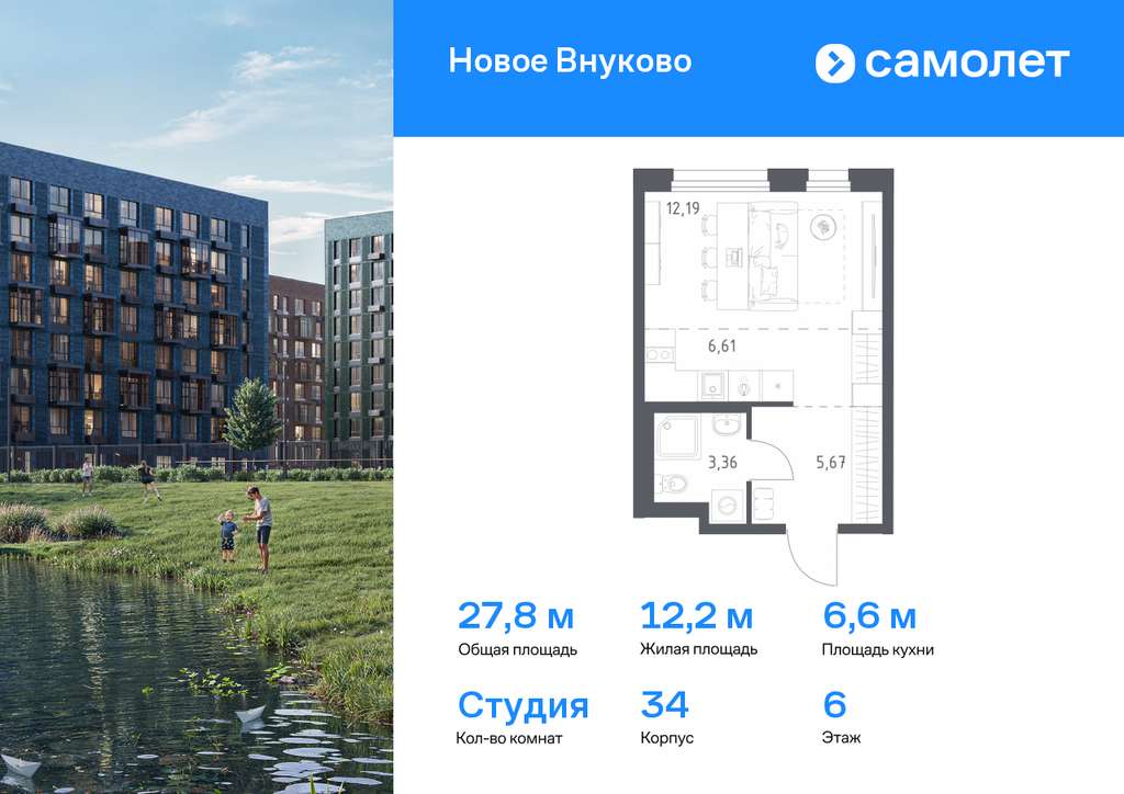 Строим кварталы для жизни с заботой о будущем. Предлагается квартира студия комфорт-класса 27,83 кв. м в корпусе 34 на 6 этаже, в ЖК «Новое Внуково»