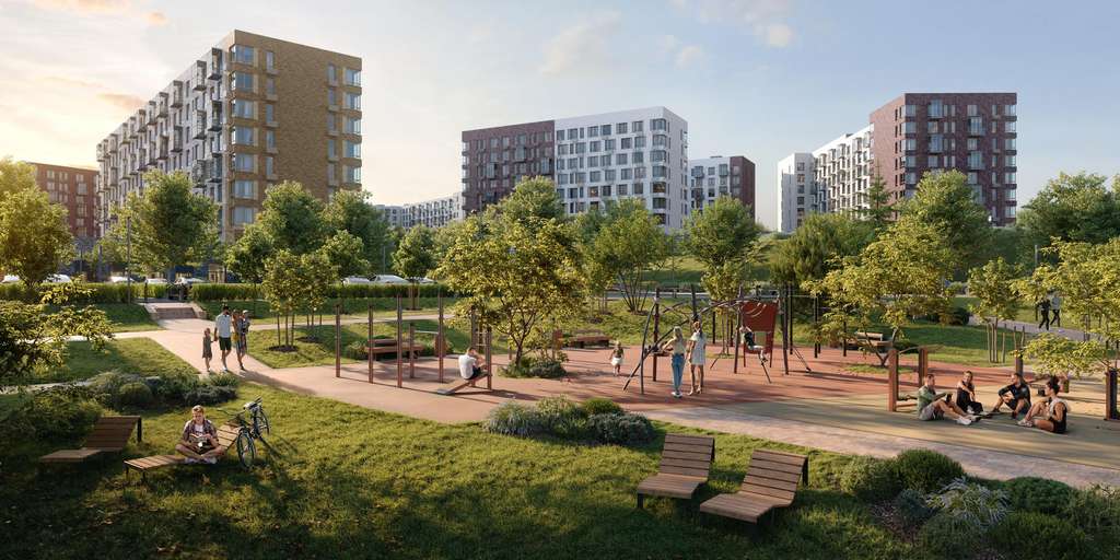 Дворы-парки будут радовать жителей цветением и зеленью: здесь высадят липы, сосны, ели, клены и сирень. Плэйхаб станет местом встреч всех любителей активного отдыха: застройщик оборудует зоны тренажеров и воркаута, площадки для игр в настольный теннис, мяч, шахматы. Также появятся современные игровые площадки для детей.