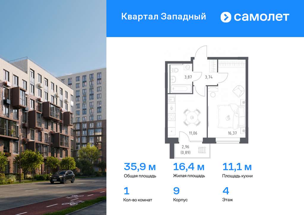 Строим кварталы для жизни с заботой о будущем. Предлагается 1-комнатная квартира комфорт-класса 35,93 кв. м в корпусе 9 на 4 этаже, в ЖК «Квартал Западный»
