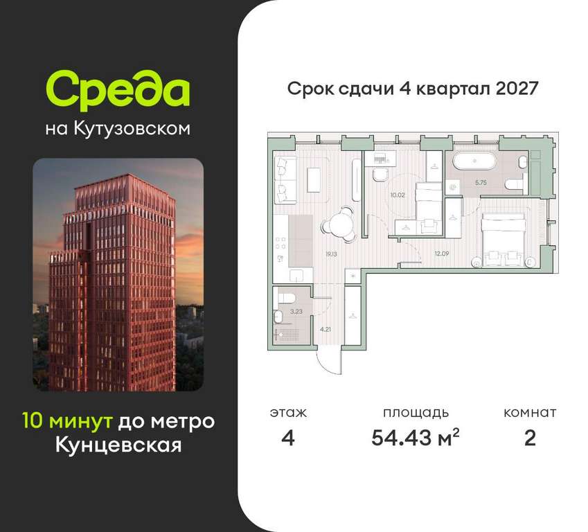 Квартира располагается на 4 этаже 12-этажного дома в ЖК Среда на Кутузовском.