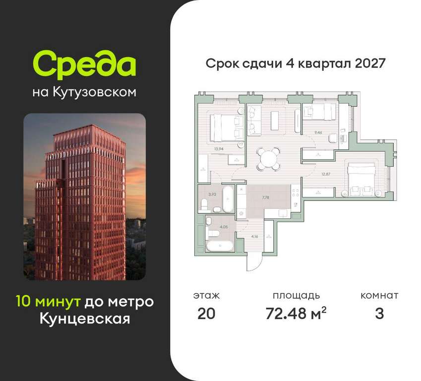 Квартира располагается на 20 этаже 30-этажного дома в ЖК Среда на Кутузовском.
