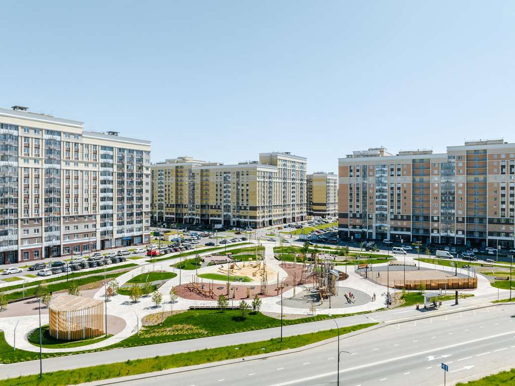 В квартале — монолитные дома комфортной высоты, от 10 этажей. Светлые фасады украшают кирпичные вставки в теплых природных оттенках.