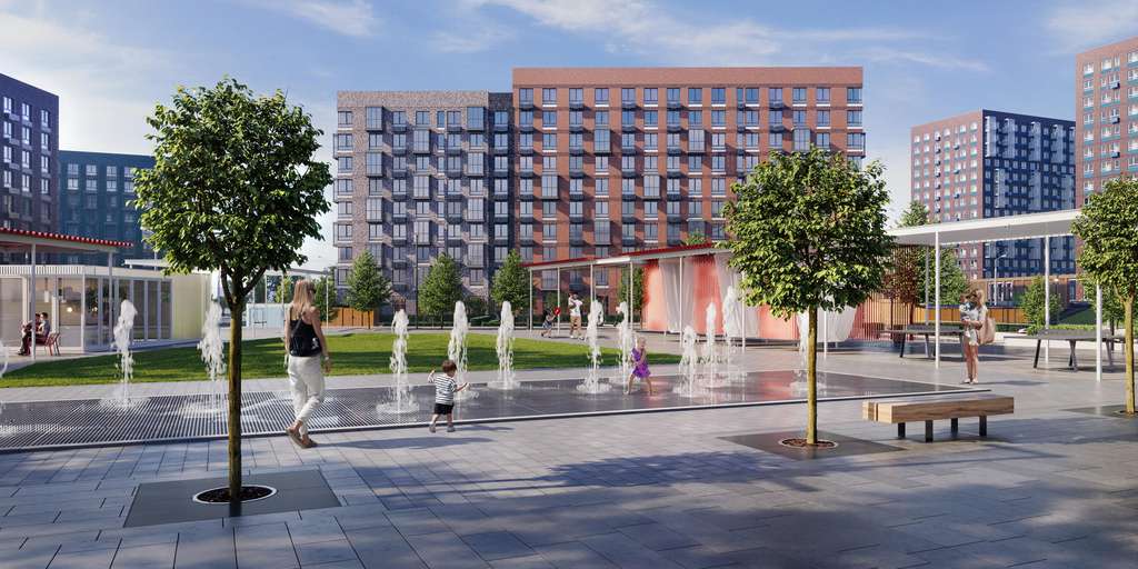 Дворы-парки закрыты от машин и посторонних. На территории — прогулочный маршрут вдоль реки Незнайка и набережная с шезлонгами и качелями для отдыха. Также здесь появится плейхаб «Незнайка на Луне», площадь для мероприятий с сухим фонтаном, летним кинотеатром и кафе.