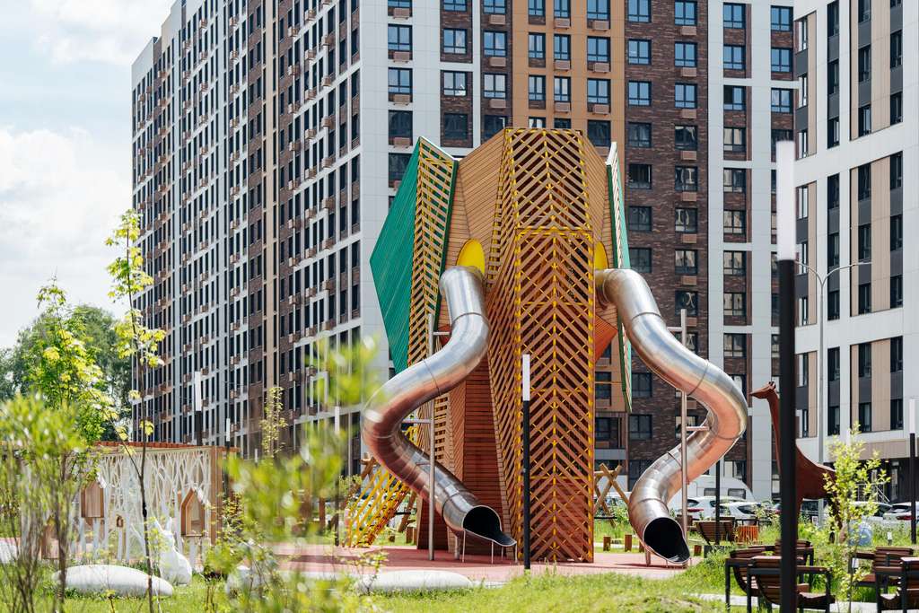 Ребенок любого возраста найдет увлекательное занятие в уже готовом плейхабе с большой горкой в виде слона и уникальным игровым оборудованием. Пока дети играют, родители могут прогуляться по бульвару или отдохнуть под навесом из растений.