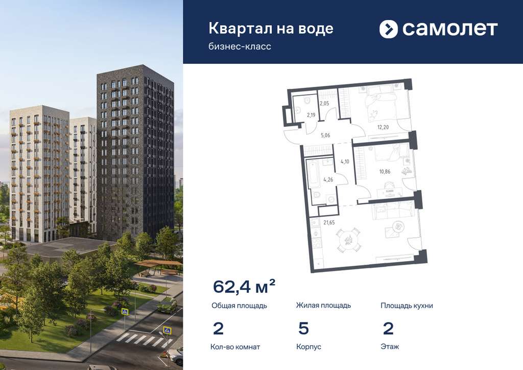 Строим кварталы для жизни с заботой о будущем. Предлагается 2-комнатная квартира бизнес-класса 62,37 кв. м в корпусе 5 на 2 этаже, в ЖК «Квартал на воде»