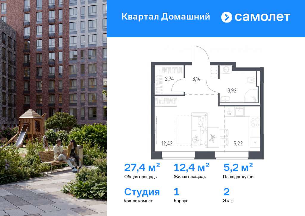 Строим кварталы для жизни с заботой о будущем. Предлагается квартира студия комфорт-класса 27,44 кв. м в корпусе 1 на 2 этаже, в ЖК «Квартал Домашний»