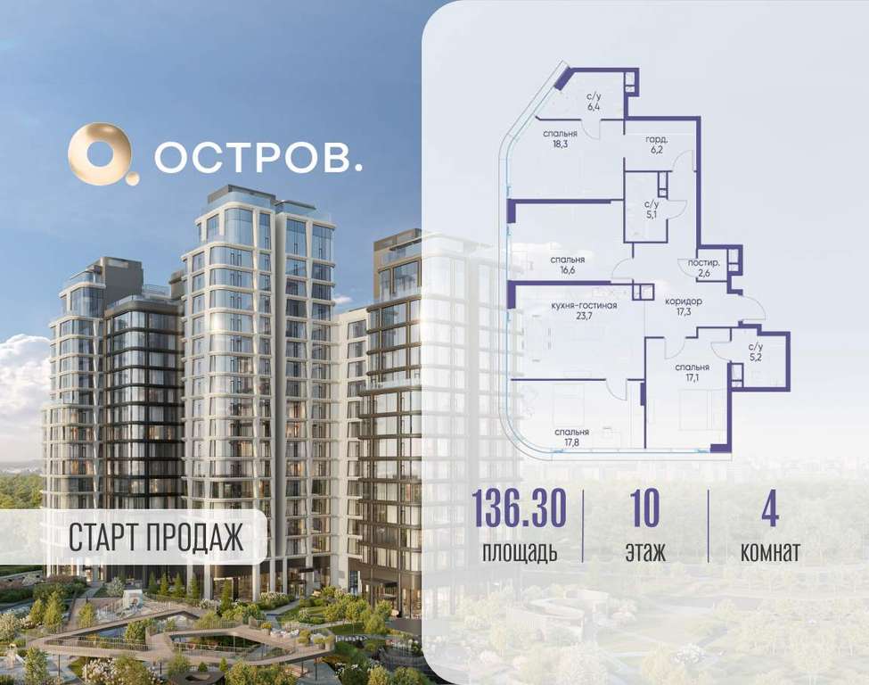 Продаётся 4-комн. квартира от застройщика: общая площадь 136.30 м, жилая 69.80 м, кухня 23.70 м, 10-й этаж, жилой квартал «Остров 12», корпус 6 (секция 9) . Срок сдачи: 1 квартал 2029 года.