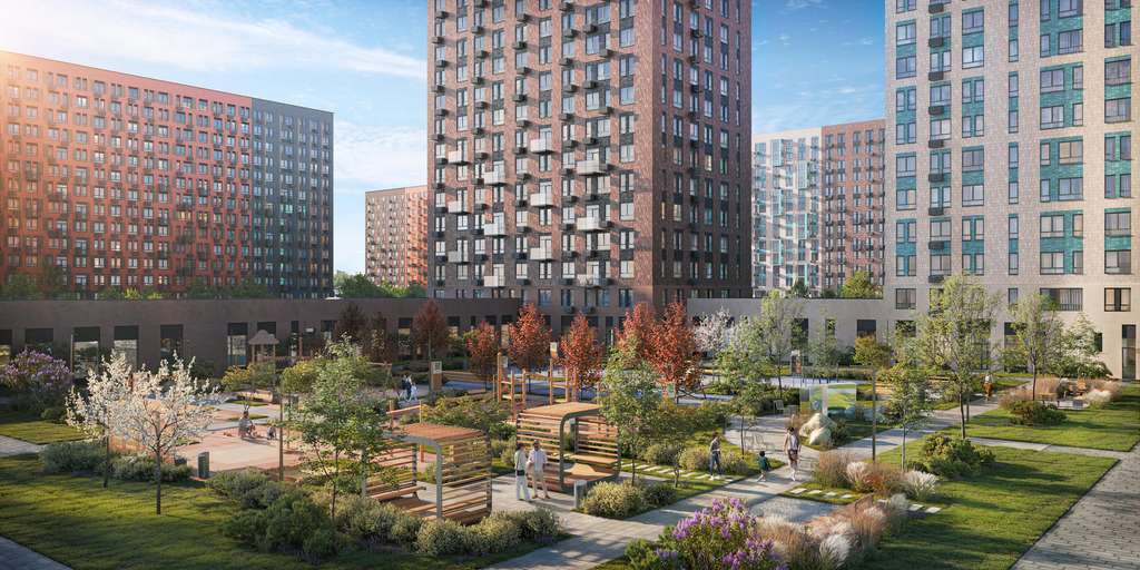 В квартале — монолитные дома комфортной высоты, от 10 этажей. Светлые фасады украшают кирпичные вставки в теплых природных оттенках.