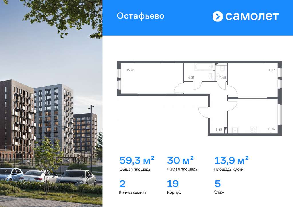 Строим кварталы для жизни с заботой о будущем. Предлагается 2-комнатная квартира комфорт-класса 59,26 кв. м в корпусе 19 на 5 этаже, в ЖК «Остафьево»