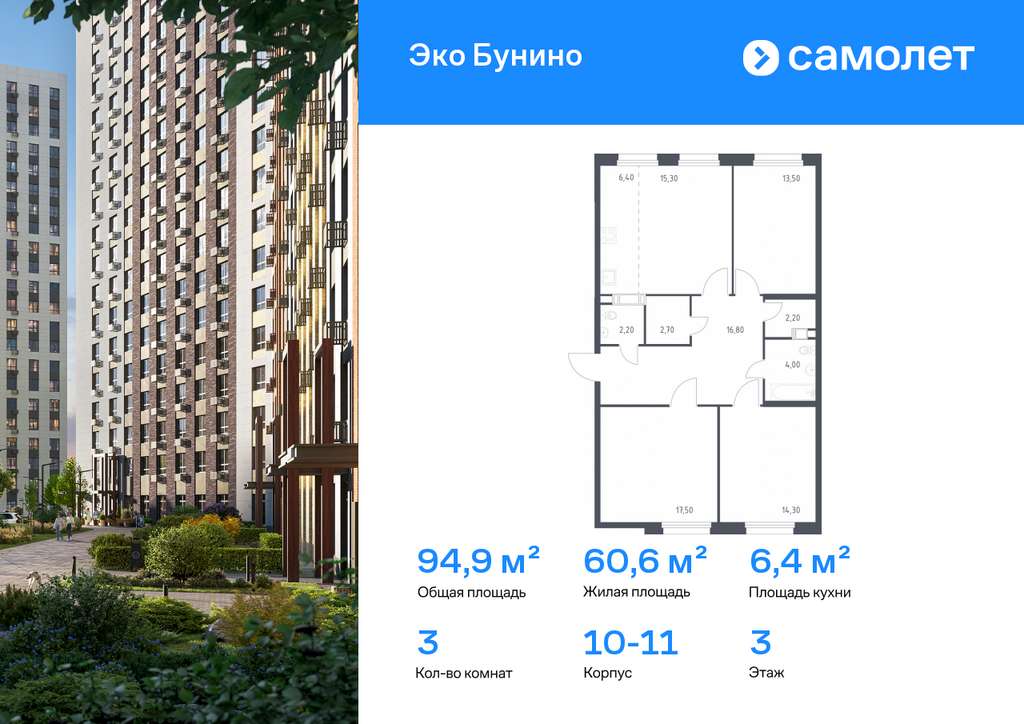 Строим кварталы для жизни с заботой о будущем. Предлагается 3-комнатная квартира комфорт-класса 94,9 кв. м в корпусе 10-11 на 3 этаже, в ЖК «Эко Бунино»