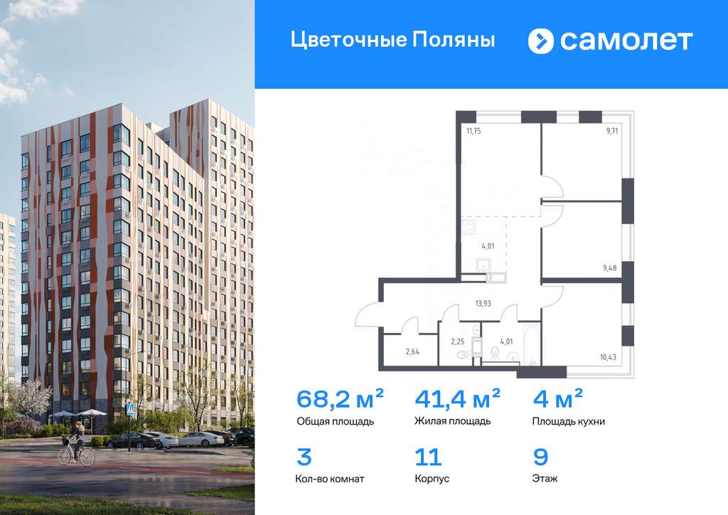 Строим кварталы для жизни с заботой о будущем. Предлагается 3-комнатная квартира комфорт-класса 68,21 кв. м в корпусе 11 на 9 этаже, в ЖК «Цветочные Поляны»