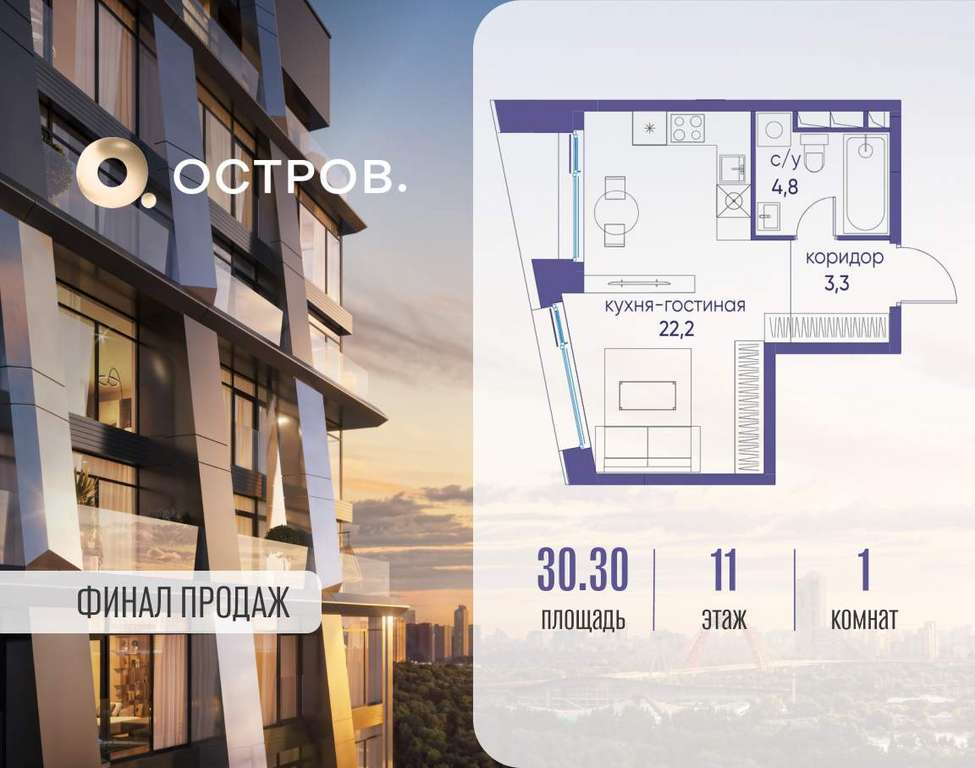 Продаётся квартира от застройщика: общая площадь 30.30 м, жилая 17.20 м, кухня 5.00 м, 11-й этаж, жилой квартал «Остров 12», корпус 1 (секция 2) . Срок сдачи: 1 квартал 2029 года.