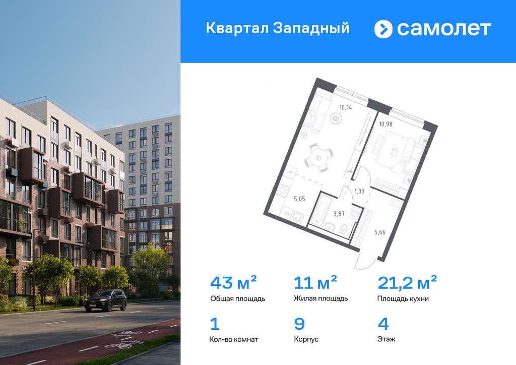 Строим кварталы для жизни с заботой о будущем. Предлагается 1-комнатная квартира комфорт-класса 43,03 кв. м в корпусе 9 на 4 этаже, в ЖК «Квартал Западный»