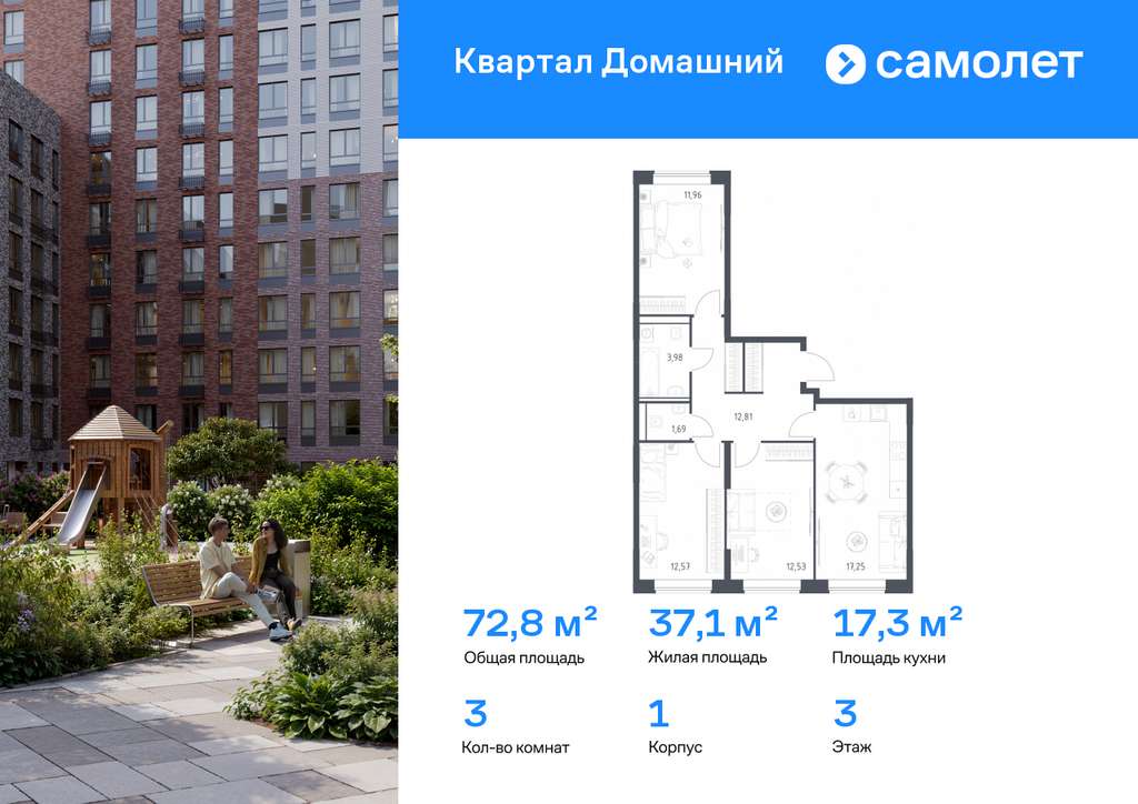 Строим кварталы для жизни с заботой о будущем. Предлагается 3-комнатная квартира комфорт-класса 72,79 кв. м в корпусе 1 на 3 этаже, в ЖК «Квартал Домашний»