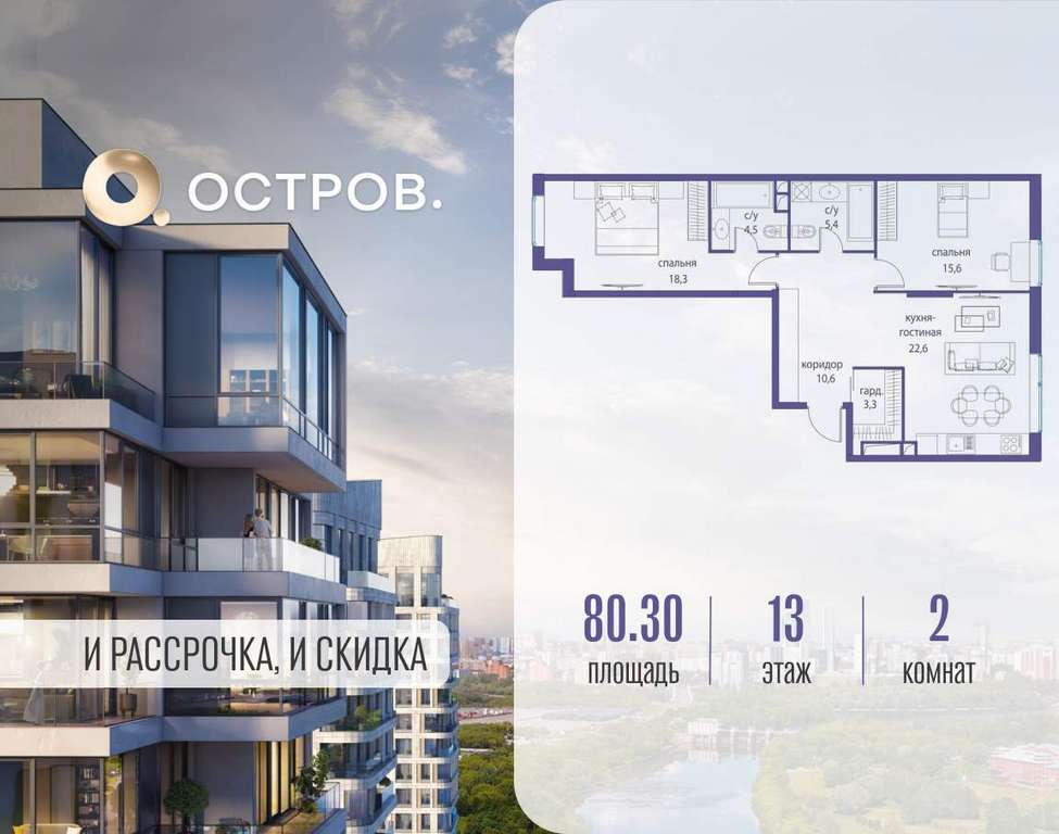 Продаётся 2-комн. квартира от застройщика: общая площадь 80.30 м, жилая 33.90 м, кухня 22.60 м, 13-й этаж, жилой квартал «Остров 4», корпус 7 (секция 5) . Срок сдачи: 3 квартал 2025 года.