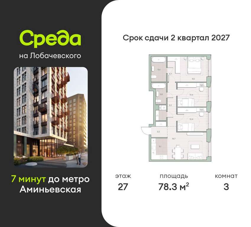Квартира располагается на 27 этаже 27-этажного дома в ЖК Среда на Лобачевского.