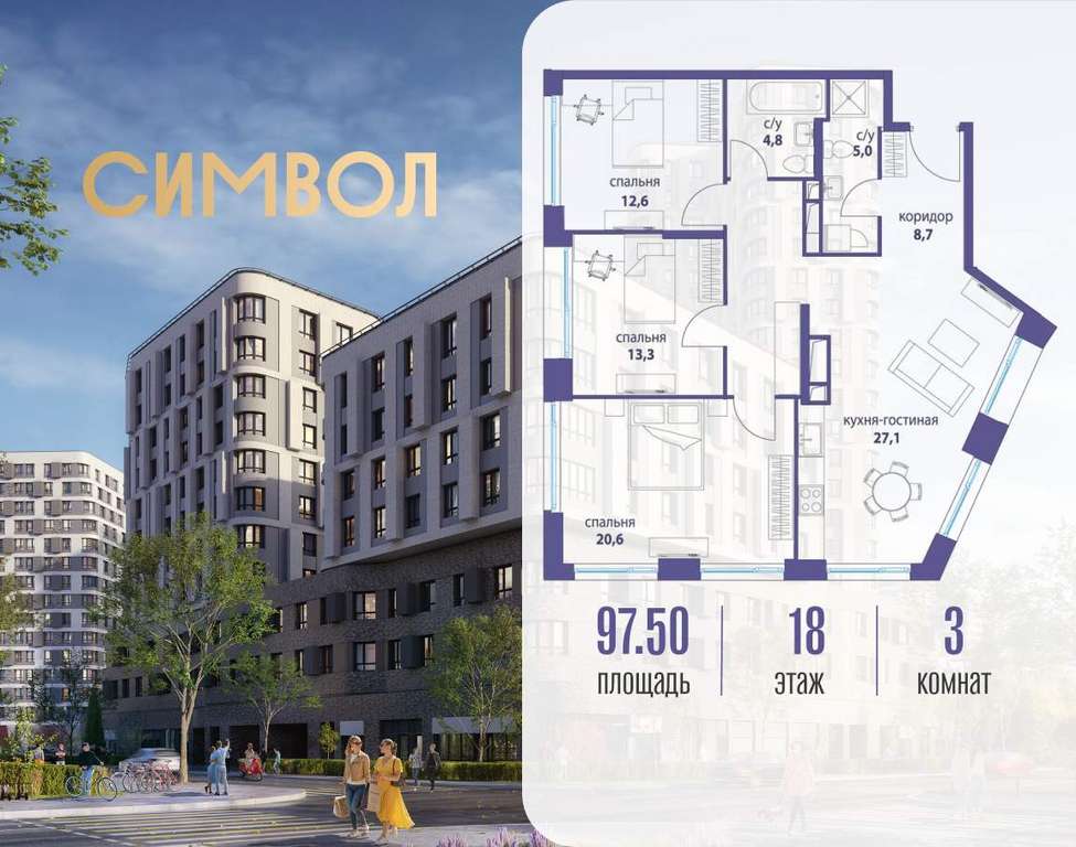 Продается 3-комнатная квартира от застройщика: общая площадь 97.50 м, жилая 46.50 м, кухня 27.10 м, 18-й этаж, жилой квартал «Вдохновение», корпус 28 (секция 1) . Срок сдачи: 1 квартал 2026 года.