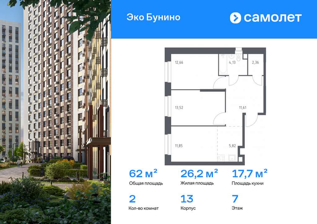 Строим кварталы для жизни с заботой о будущем. Предлагается 2-комнатная квартира комфорт-класса 61,95 кв. м в корпусе 13 на 7 этаже, в ЖК «Эко Бунино»