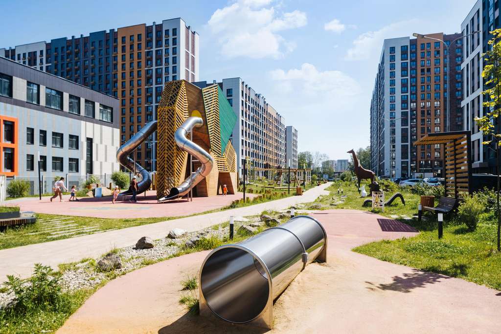 Ребенок любого возраста найдет увлекательное занятие в уже готовом плейхабе с большой горкой в виде слона и уникальным игровым оборудованием. Пока дети играют, родители могут прогуляться по бульвару или отдохнуть под навесом из растений.