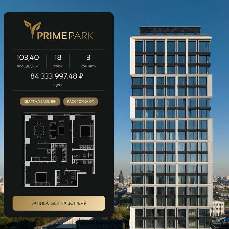 Квартира располагается на 18 этаже 41-этажного дома в ЖК Прайм Парк.