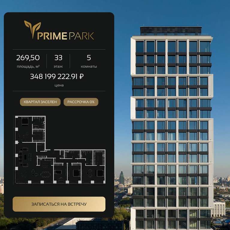 Квартира располагается на 33 этаже 41-этажного дома в ЖК Прайм Парк.