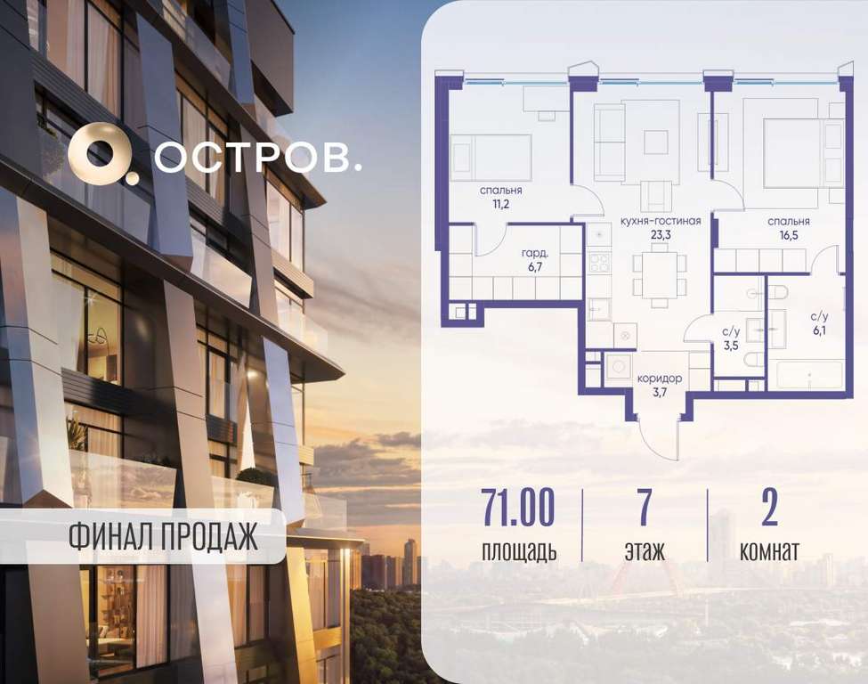 Продаётся 2-комн. квартира от застройщика: общая площадь 71.00 м, жилая 27.70 м, кухня 23.30 м, 7-й этаж, жилой квартал «Остров 12», корпус 2 (секция 1) . Срок сдачи: 1 квартал 2029 года.