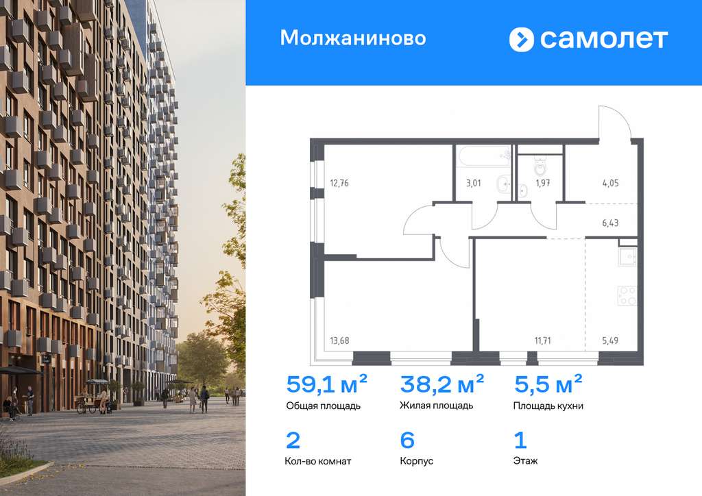 Строим кварталы для жизни с заботой о будущем. Предлагается 2-комнатная квартира комфорт-класса 59,1 кв. м в корпусе 6 на 1 этаже, в ЖК «Молжаниново»