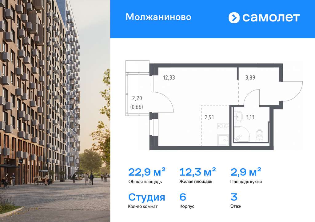 Строим кварталы для жизни с заботой о будущем. Предлагается квартира студия комфорт-класса 22,92 кв. м в корпусе 6 на 3 этаже, в ЖК «Молжаниново»