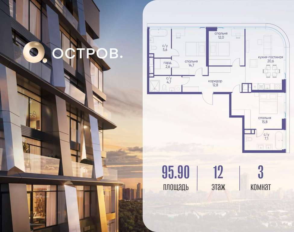 Продаётся 3-комн. квартира от застройщика: общая площадь 95.90 м, жилая 42.50 м, кухня 20.60 м, 12-й этаж, жилой квартал «Остров 12», корпус 5 (секция 1) . Срок сдачи: 1 квартал 2029 года.