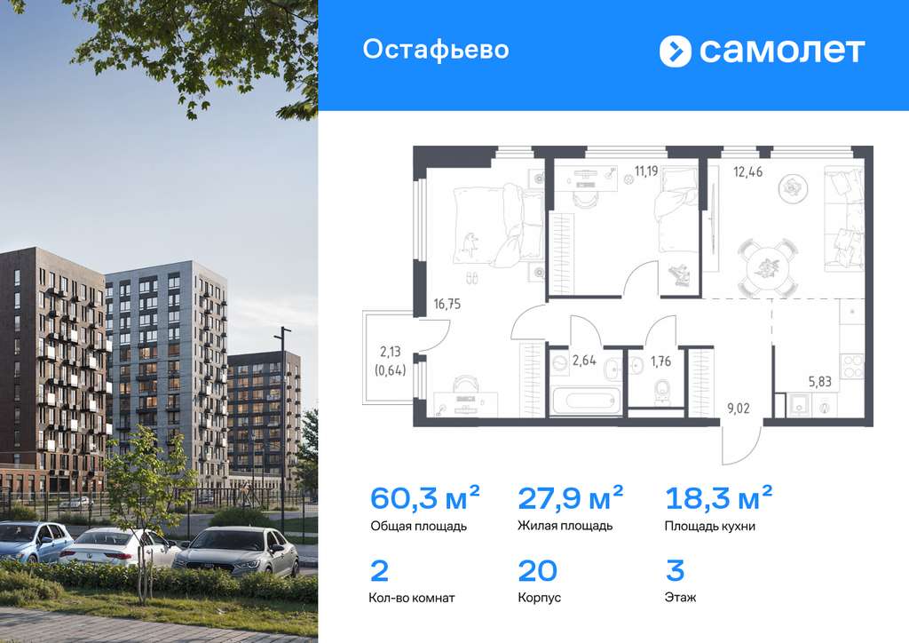 Строим кварталы для жизни с заботой о будущем. Предлагается 2-комнатная квартира комфорт-класса 60,29 кв. м в корпусе 20 на 3 этаже, в ЖК «Остафьево»