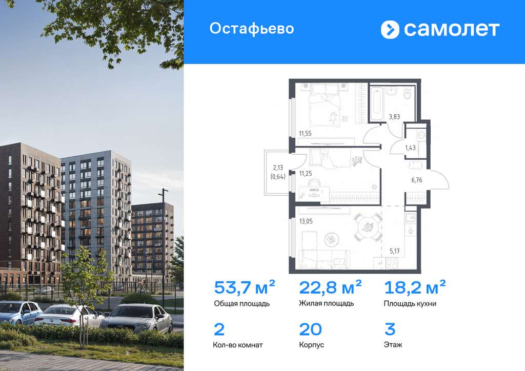 Строим кварталы для жизни с заботой о будущем. Предлагается 2-комнатная квартира комфорт-класса 53,68 кв. м в корпусе 20 на 3 этаже, в ЖК «Остафьево»