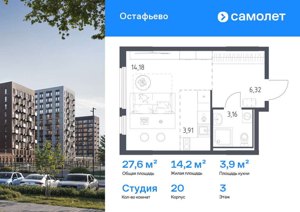 Строим кварталы для жизни с заботой о будущем. Предлагается квартира студия комфорт-класса 27,57 кв. м в корпусе 20 на 3 этаже, в ЖК «Остафьево»