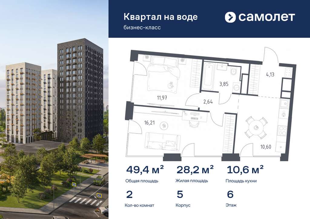 Строим кварталы для жизни с заботой о будущем. Предлагается 2-комнатная квартира бизнес-класса 49,4 кв. м в корпусе 5 на 6 этаже, в ЖК «Квартал на воде»