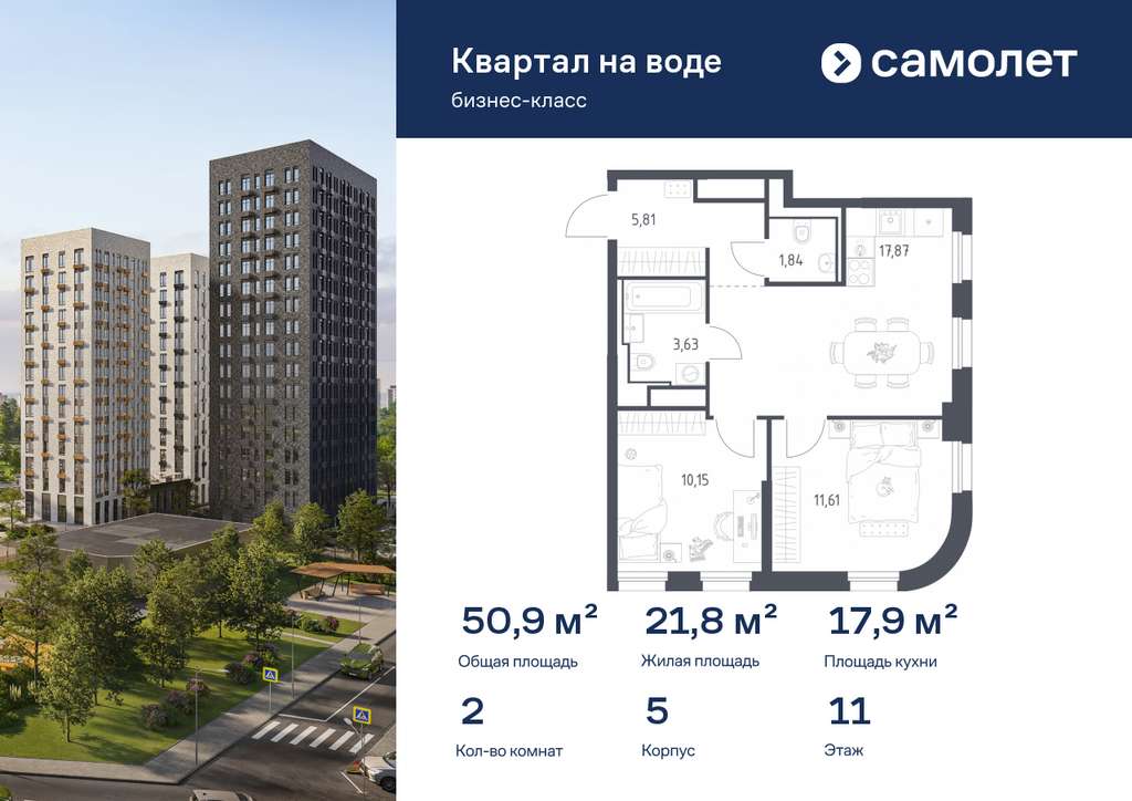 Строим кварталы для жизни с заботой о будущем. Предлагается 2-комнатная квартира бизнес-класса 50,91 кв. м в корпусе 5 на 11 этаже, в ЖК «Квартал на воде»