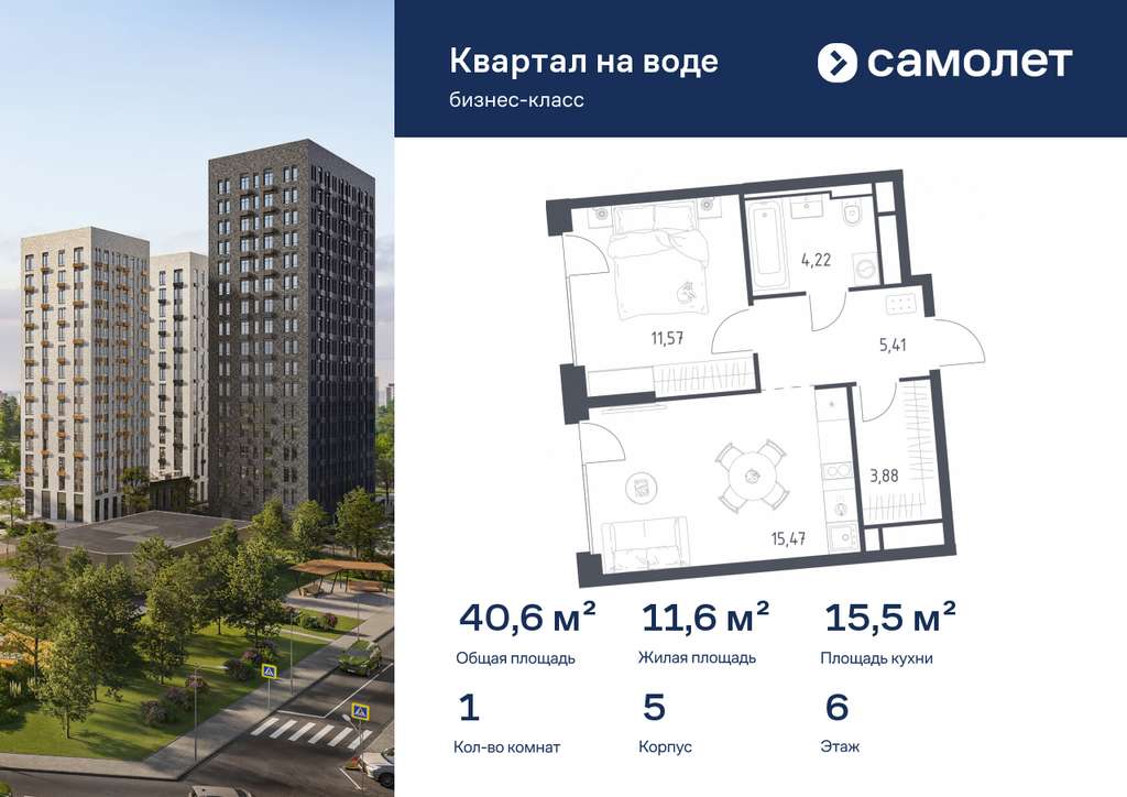 Строим кварталы для жизни с заботой о будущем. Предлагается 1-комнатная квартира бизнес-класса 40,55 кв. м в корпусе 5 на 6 этаже, в ЖК «Квартал на воде»