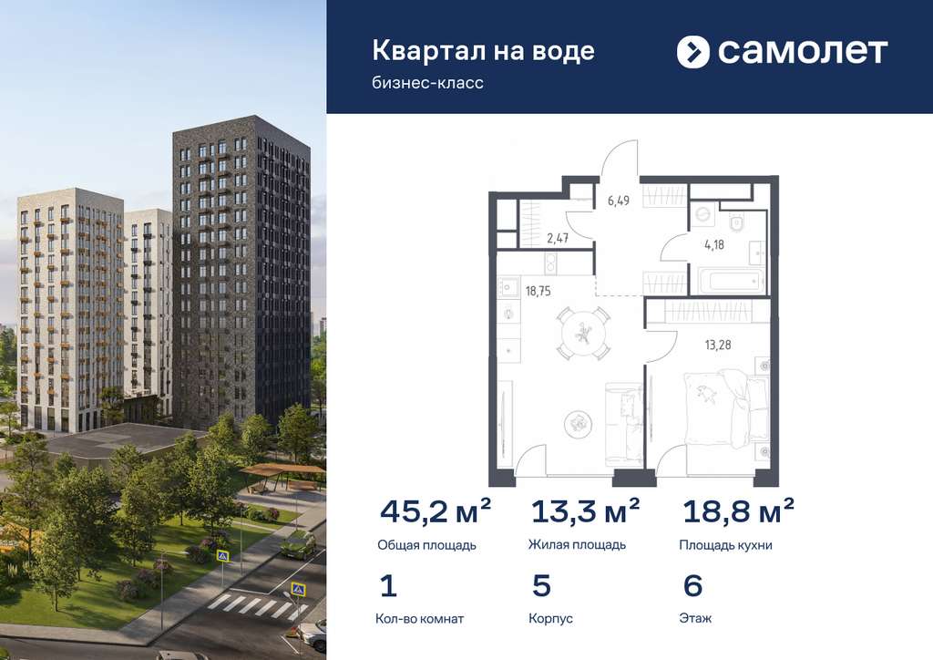 Строим кварталы для жизни с заботой о будущем. Предлагается 1-комнатная квартира бизнес-класса 45,17 кв. м в корпусе 5 на 6 этаже, в ЖК «Квартал на воде»