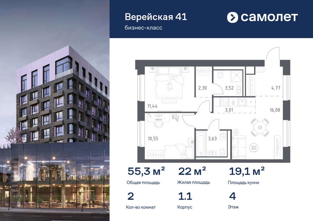 Строим кварталы для жизни с заботой о будущем. Предлагается 2-комнатная квартира бизнес-класса 55,3 кв. м в корпусе 1.1 на 4 этаже, в «Верейская 41»