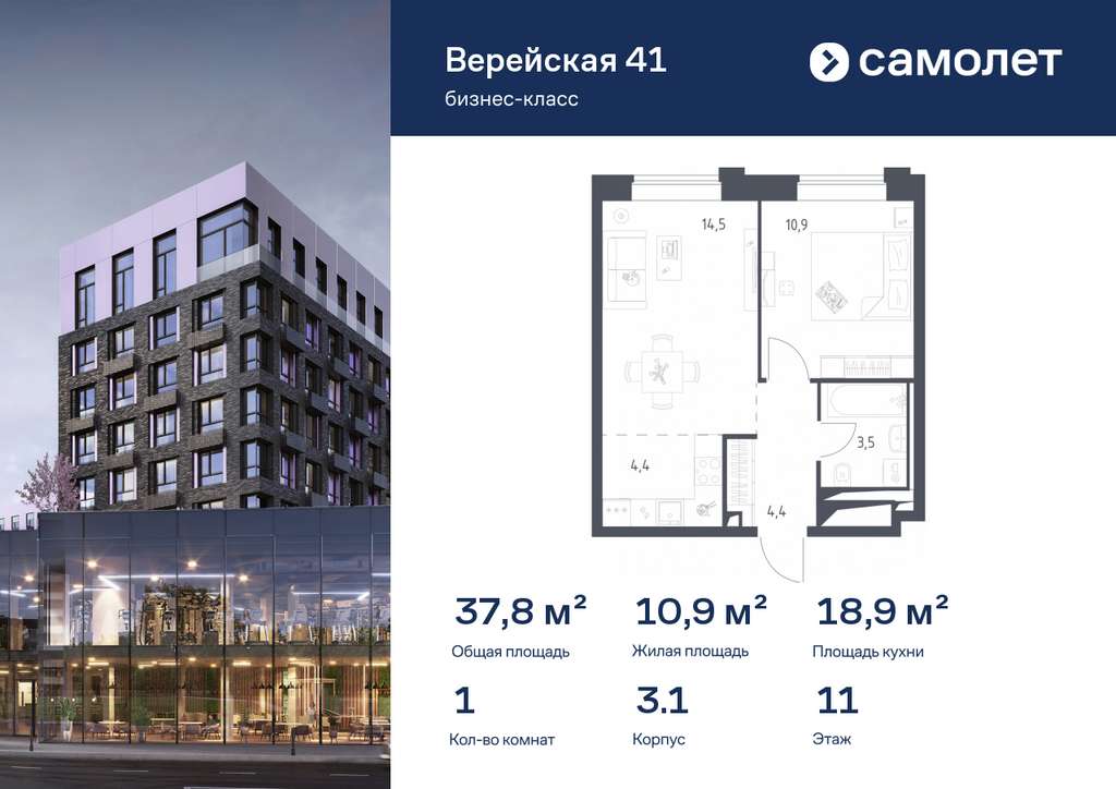 Строим кварталы для жизни с заботой о будущем. Предлагается 1-комнатная квартира бизнес-класса 37,75 кв. м в корпусе 3.1 на 11 этаже, в «Верейская 41»