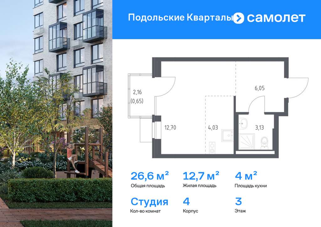 Строим кварталы для жизни с заботой о будущем. Предлагается квартира студия комфорт-класса 26,56 кв. м в корпусе 4 на 3 этаже, в ЖК «Подольские Кварталы»