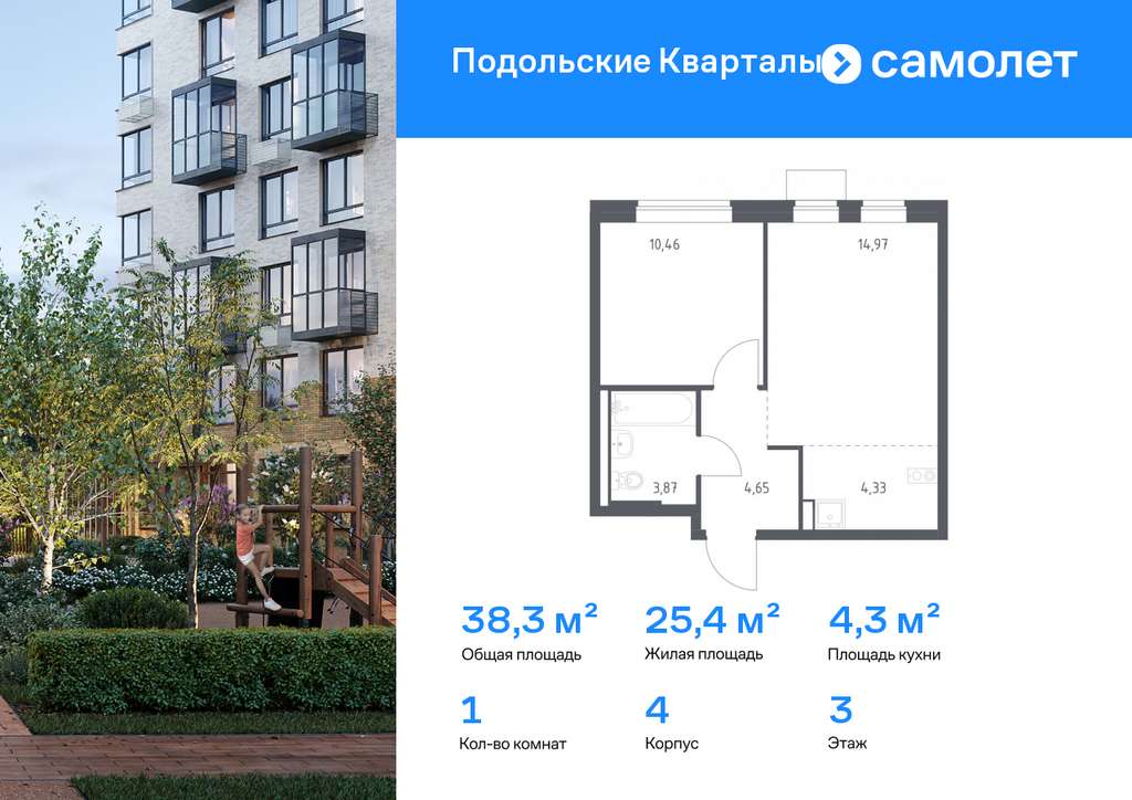 Строим кварталы для жизни с заботой о будущем. Предлагается 1-комнатная квартира комфорт-класса 38,28 кв. м в корпусе 4 на 3 этаже, в ЖК «Подольские Кварталы»