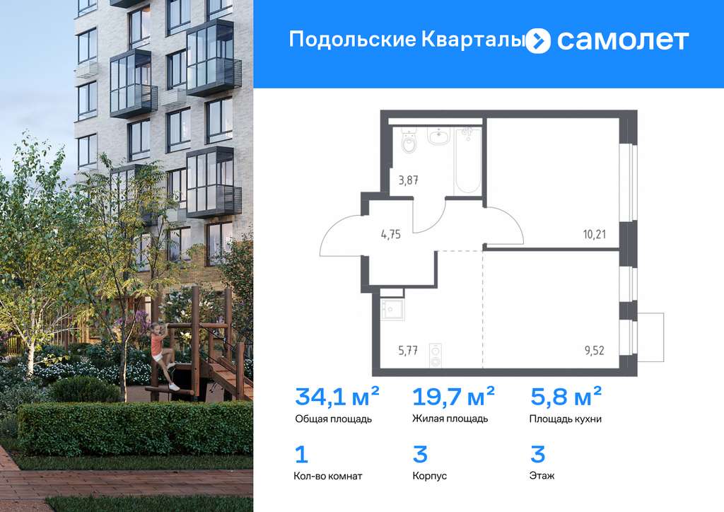 Строим кварталы для жизни с заботой о будущем. Предлагается 1-комнатная квартира комфорт-класса 34,12 кв. м в корпусе 3 на 3 этаже, в ЖК «Подольские Кварталы»