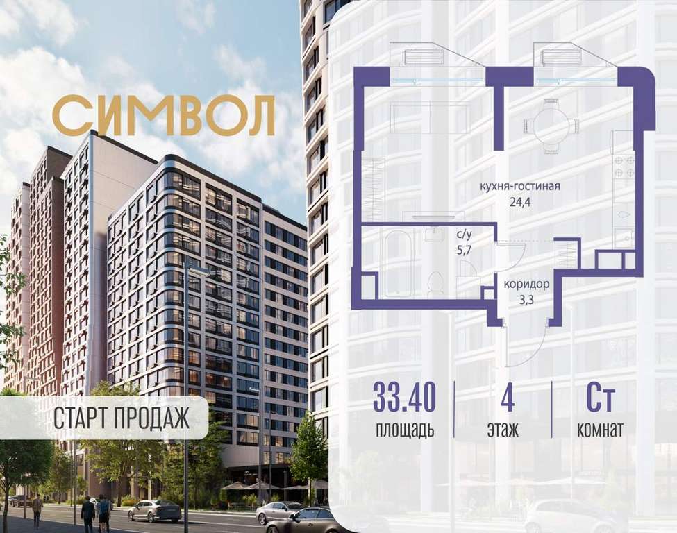 Продается квартира-студия от застройщика: общая площадь 33.40 м, жилая 10.00 м, кухня 14.40 м, 4-й этаж, жилой квартал «Гордость», корпус 36 (секция 4) . Срок сдачи: 2 квартал 2029 года.
