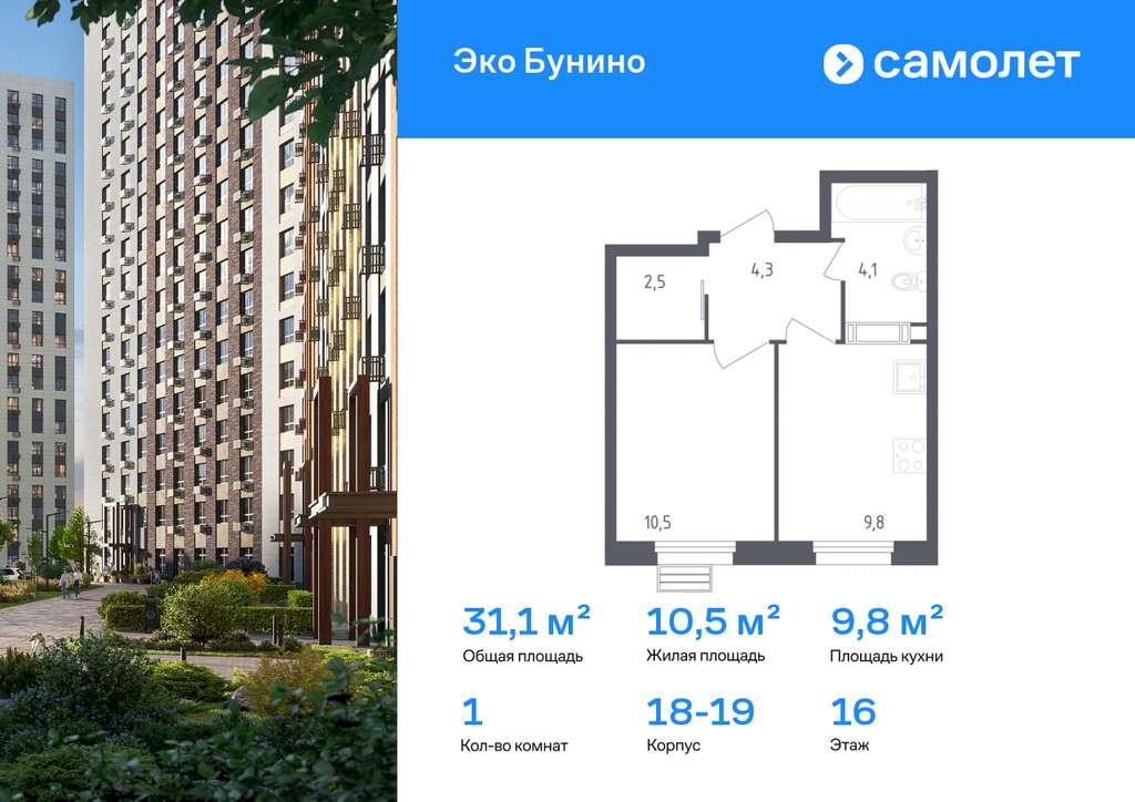 Строим кварталы для жизни с заботой о будущем. Предлагается 1-комнатная квартира комфорт-класса 31,1 кв. м в корпусе 18-19 на 16 этаже, в ЖК «Эко Бунино»