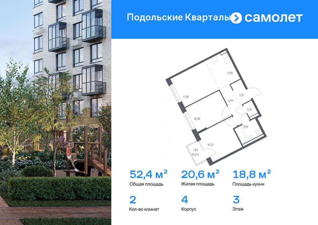 Строим кварталы для жизни с заботой о будущем. Предлагается 2-комнатная квартира комфорт-класса 52,44 кв. м в корпусе 4 на 3 этаже, в ЖК «Подольские Кварталы»