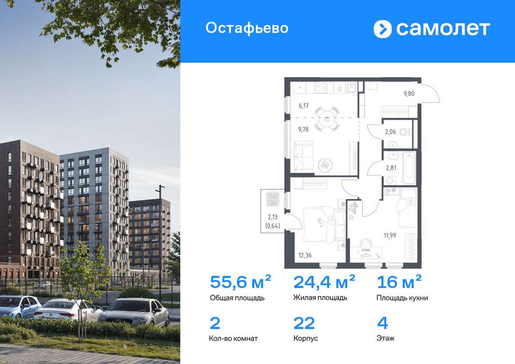 Строим кварталы для жизни с заботой о будущем. Предлагается 2-комнатная квартира комфорт-класса 55,61 кв. м в корпусе 22 на 4 этаже, в ЖК «Остафьево»
