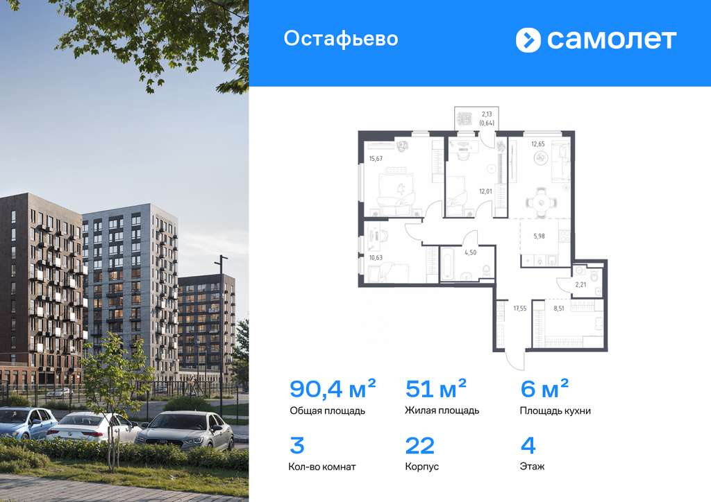 Строим кварталы для жизни с заботой о будущем. Предлагается 3-комнатная квартира комфорт-класса 90,35 кв. м в корпусе 22 на 4 этаже, в ЖК «Остафьево»