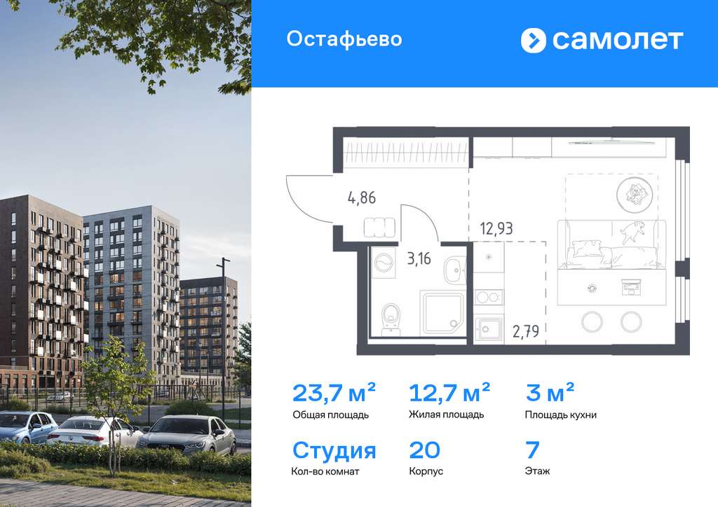 Строим кварталы для жизни с заботой о будущем. Предлагается квартира студия комфорт-класса 23,74 кв. м в корпусе 20 на 7 этаже, в ЖК «Остафьево»