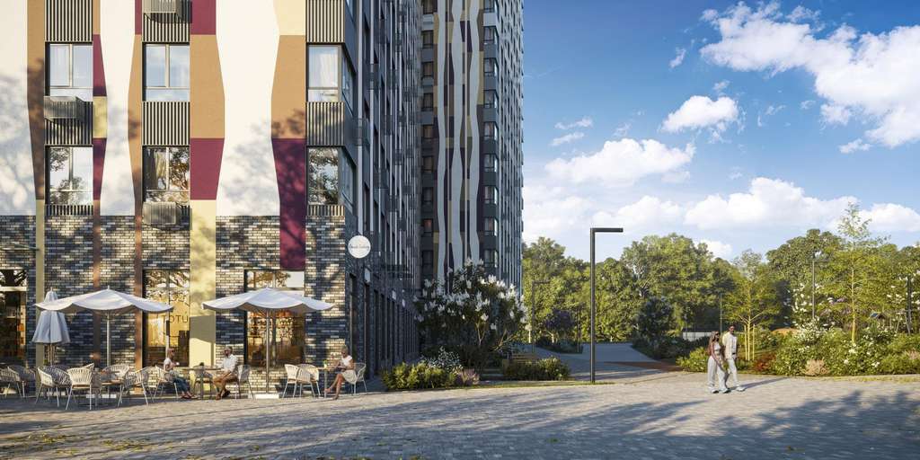 Дома высотой до 22 этажей построены по монолитной технологии. Рисунок на фасадах отсылает к традиционному искусству Староселья — плетению кружев из стекляруса.