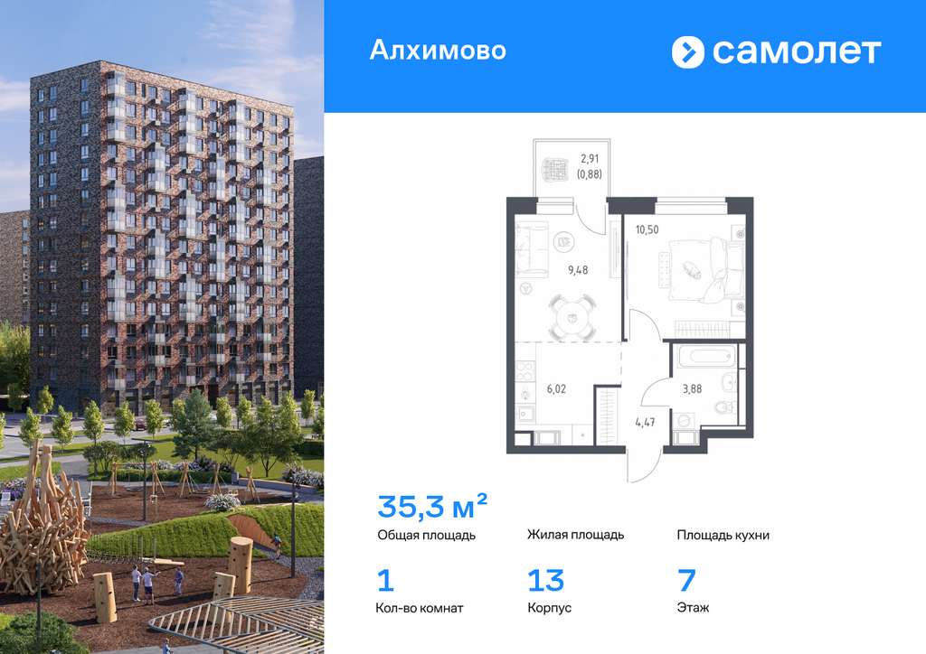 Строим кварталы для жизни с заботой о будущем. Предлагается 1-комнатная квартира комфорт-класса 35,3 кв. м в корпусе 13 на 7 этаже, в ЖК «Алхимово»