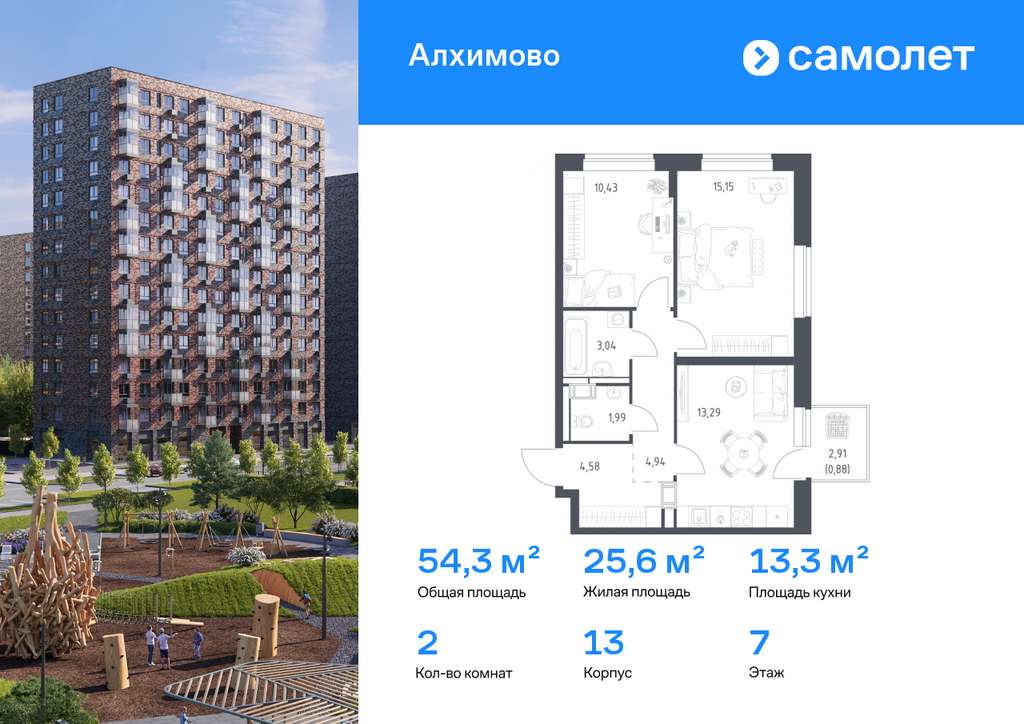 Строим кварталы для жизни с заботой о будущем. Предлагается 2-комнатная квартира комфорт-класса 54,3 кв. м в корпусе 13 на 7 этаже, в ЖК «Алхимово» Квартира с чистовой отделкой. Доступность дополнительных опций уточняйте у застройщика. Приобрести квартиру возможно по специальным акциям от застройщика, с текущими условиями акций можно ознакомиться в блоке «Акций». Цена динамическая и может отличаться, уточняйте актуальность у застройщика. «Алхимово» — жилой комплекс в Новой Москве, в 16 км от МКАД. Рядом — живописный Дубровицкий лесопарк и река Десна. На территории уже есть свои школа и детский сад, ведется строительство еще одного детского сада. Супермаркеты, аптеки и кафе — в паре шагов от дома. В будущем появится свой торговый центр. В квартале есть воркаут-зона, игровые площадки, отдельная площадка для выгула собак. Дворы закрыты от машин, для автомобилистов предусмотрен многоуровневый паркинг. В проекте — монолитные дома высотой от 8 до 16 этажей. Фасады облицованы декоративным кирпичом естественных оттенков.